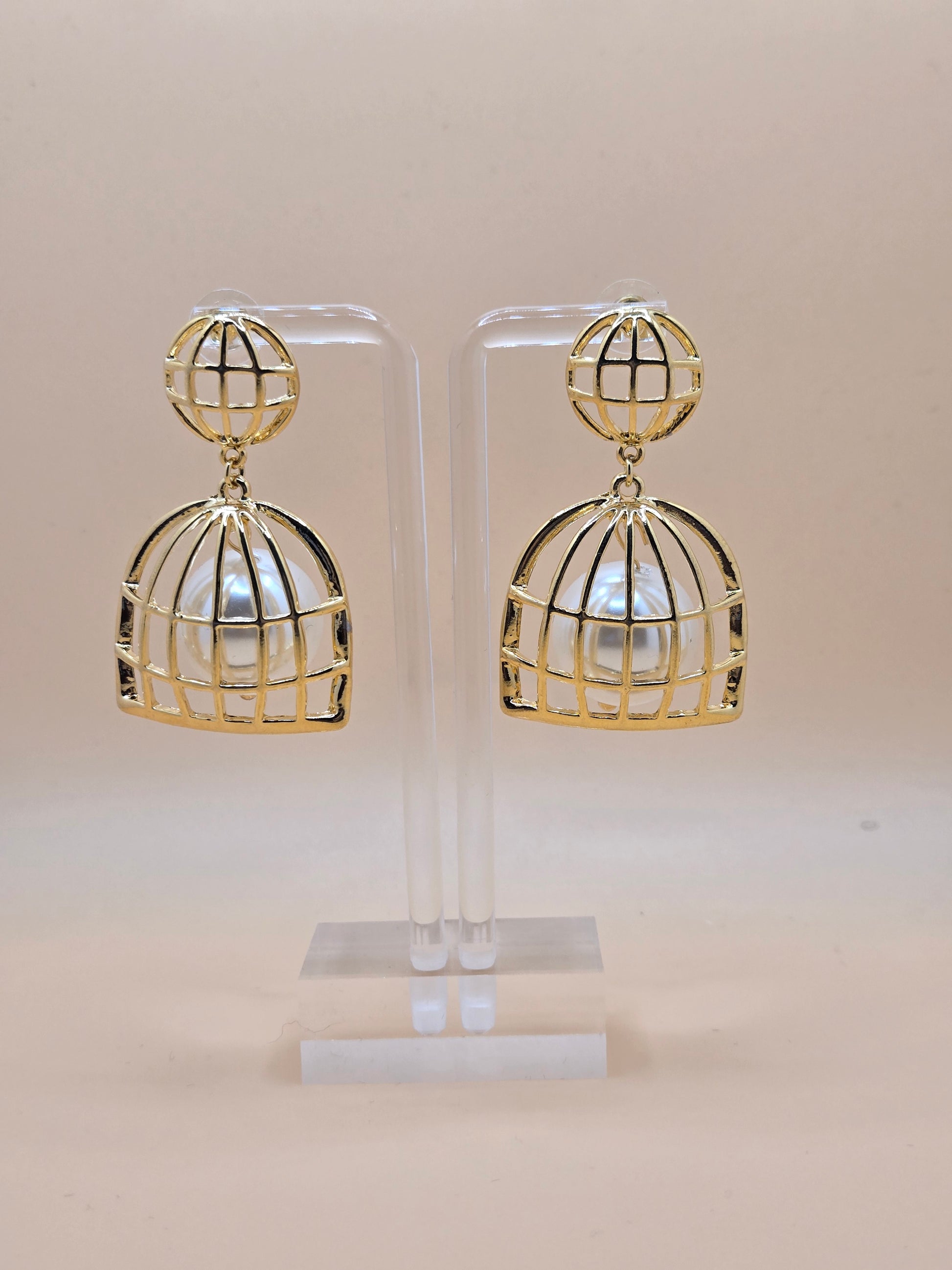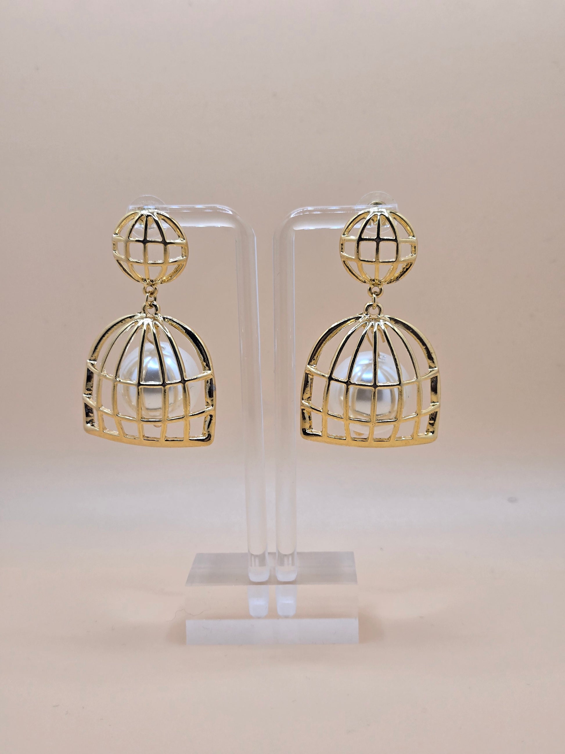 These earrings add a touch of luxury and creativity to any outfit. Whether paired with a sleek dress or a simple blouse, the gold cage and pearl combination makes a lasting impression.